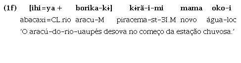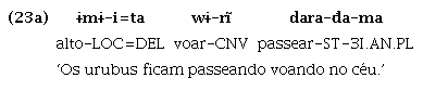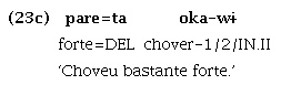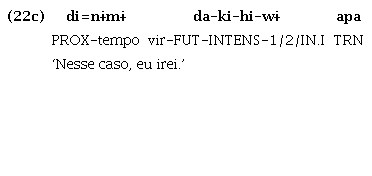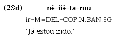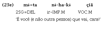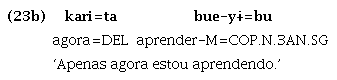 A liberdade sintática e a natureza funcional deste morfema somam-se a dois outros fatores que nos levam a analisá-lo como um tipo de enclítico do sintagma. Em termos distribucionais, =ta ‘delimitador’ segue a afixos e clíticos da palavra, bem como afixos do sintagma, e pode vir antes dos morfemas de cópula, como em (23d), ou os seguindo, como em (23f). Fonologicamente, tem como hospedeiro tanto a palavra anterior, que lhe serve de base semântica, quanto uma posterior. Pode também aparecer acentuado (independente, sob um ponto de vista métrico). A análise que proponho é que este é um morfema essencialmente pragmático e que desenvolve funções mais gramaticais, como aspecto inceptivo – em (23d) – ou intensificador de modificadores verbais e nominais – exemplos (23a) a (23d) –, a partir de um processo de extensão funcional. Seria, assim, uma partícula que desempenha eventualmente a função de morfemas típicos da morfossintaxe dos sintagmas verbal e nominal, algo como a imagem espelhada de morfemas como bahu e kari, que seriam nomes e advérbios que desenvolveram funções pragmáticas.