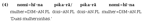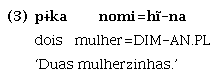 Um outro exemplo de enclítico formativo da palavra é o morfema =hĩ- ‘diminutivo’. Ao se combinar com uma palavra, semelhantemente a um classificador ou a uma raiz nominal em um composto, o diminutivo funciona como o núcleo da nova palavra, alterando a forma dos morfemas flexionais de gênero e número. Por exemplo, põe-wa ‘pessoas’ e põe=hĩ-na ‘pessoazinhas’, onde o morfema de plural muda de -wa para -na, uma vez que é o diminutivo que o seleciona, e não a raiz (as formas *põe-na e *põe=hĩ-wa não são possíveis).