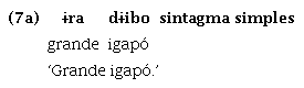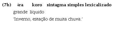 Quando o modificador é um adjetivo, notamos, ainda, um grau a mais de complexidade na relação gradual entre léxico, morfologia e sintaxe, pois, em palavras como ãi ñemi-kɨ, o adjetivo está lexicalizado junto ao nome, formando um novo nome. Vejamos o contraste entre (7a) e (7b), o primeiro sendo um caso de sintagma simples e o segundo de sintagma lexicalizado em um nome: