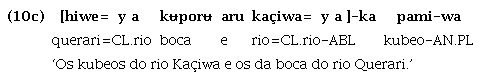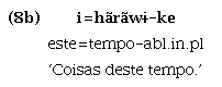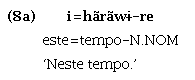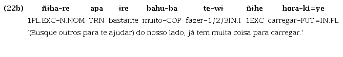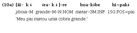 Nos exemplos em (10) ilustramos dois morfemas do sintagma: (i) -re ‘não nominativo’, regido por predicados, marca sintagmas em função de objeto diferenciado e certos adjuntos espaciais e temporais, (ii) -ka ‘ablativo’ que marca sintagmas nominais indicativos quanto à origem geográfica, étnica ou a outro tipo de pertencimento social de um outro nome. Podemos, ainda, listar outros morfemas que marcam relações sintáticas em sintagmas nominais, como: (iii) -i ‘locativo geral’, (iv) -rã ‘locativo específico’, (v) -reka ‘mesmo que X’, (vi) -pe ‘similar a X, como X’, e (vii) -i ‘possessivo’. Todos são marcas de caso. Fonologicamente, os morfemas que não começam com consoantes surdas podem ser nasalizáveis, mostrando que se comportam como os afixos da palavra. Assim, dado ainda que estes morfemas não são flexionáveis e possuem uma função sobretudo sintática, vamos classificá-los como ‘afixos do sintagma’.