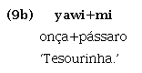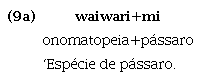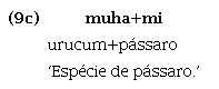 Em certos casos especiais, também encontramos um processo de lexicalização a partir do que seria originalmente um sintagma complexo. Isso ocorre sobretudo na onomástica de termos da fauna, como em (1f) e também em uma-ko hũa-ko (rã-f vermelho-f) ‘rã-vermelha (espécie de rã)/rã vermelha’. Nessa construção, teríamos duas leituras possíveis: uma como uma palavra composta, se referindo a uma espécie de rã (‘rã-vermelha’), a outra como um sintagma composto (‘rã que é vermelha’).