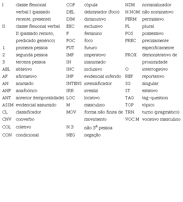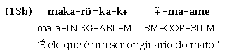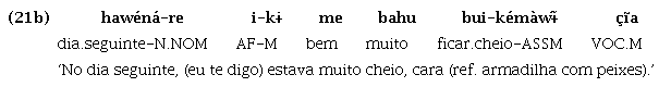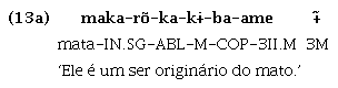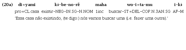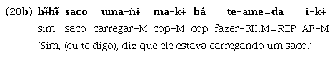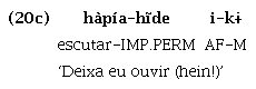 Os morfemas i-kɨ ‘afirmativo masculino’ e i-ko ‘afirmativo feminino’ são partículas com status de palavras independentes que indexam o gênero do locutor19. Sua função é a de reforçar um ato de fala declarativo, em que o falante indica sua crença em um dado estado de coisas (20a). Com predicados marcados pelo evidencial reportativo, temos a mesma função, ainda que o locutor não tenha sido a fonte primária de informação, como em (20b). Logo, não ocorrem em orações interrogativas, porém podem ocorrer com orações imperativas, como em (20c).