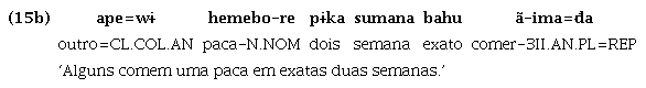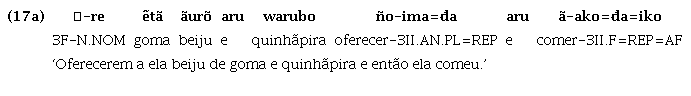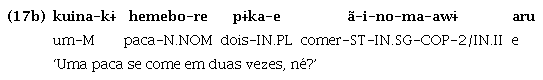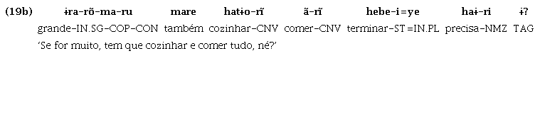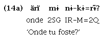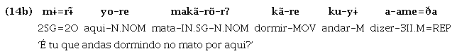 Existe, ainda, um conjunto de morfemas que podem ser agrupados por sua função de codificar relações discursivas e pragmáticas15. Estruturalmente, combinam-se com sintagmas ocorrendo após os ‘afixos do sintagma’. Assim, ainda que não possamos verificar o status de todos estes morfemas como afixos ou enclíticos, vamos tratá-los como enclíticos (seguindo a mesma heurística adotada para com os afixos do sintagma). O exemplo (14) apresenta o morfema =rɨ̃ ‘interrogativo de 2a pessoa’ de predicados verbais. Este morfema concatena-se ao sintagma focado em uma sentença interrogativa, como exemplificado em (14a) e (14b). Seu status como clítico ou afixo não pode ser determinado por propriedades fonológicas.