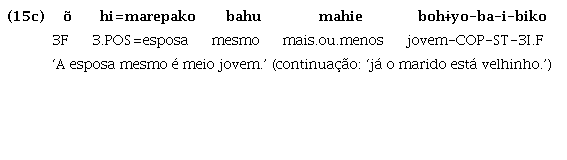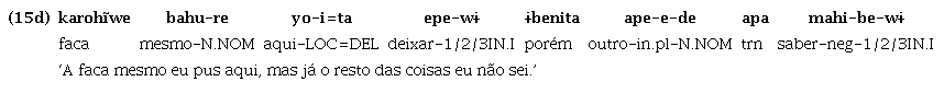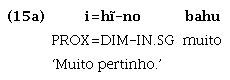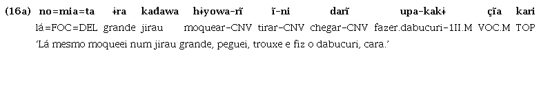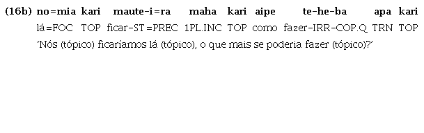 Quando usado em uma função discursiva, kari possui uma sintaxe particular, não aparecendo dentro de um sintagma, como demonstra sua posição após marcadores de foco, como mia e apa, em (16b), ou um vocativo, como em (16a). Isso o diferencia de bahu, cuja sintaxe está sempre dentro dos limites do SN. Notemos, ainda, que bahu e kari são dissílabos e sempre aparecem como palavras independentes17.