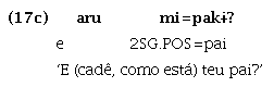 Outro morfema que adquire funções de marcador pragmático é aru, cuja função principal é sintática, como conjunção coordenativa ilustrada em (17a). Seu uso pragmático pode ser visto em (17b), onde aparece ao final de uma sentença, no sentido de demandar ao ouvinte uma resposta, como uma tag-question, e (17c), onde aparece como um elemento para iniciar uma conversação. Notemos que aru é dissílabo e sempre aparece como uma palavra independente.