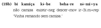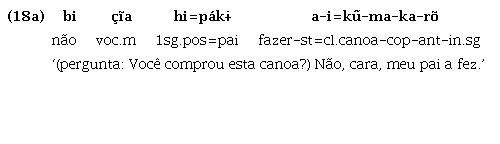 Talvez o caso mais complexo seja da interjeição bi ‘não, nada’. Essa palavra não é usada para formar a negação padrão em Kubeo, a qual é expressa por sufixo verbal. Bi pode ser usado como uma resposta negativa a qualquer pergunta ‘sim/não’ ou no início de respostas mais elaboradas, como no exemplo (18a). Em certos usos, bi se comporta como uma partícula que introduz uma sentença negativa, como em (18b). Também é usado nas expressões idiomáticas com o significado de bi+ha- (nada+passar) ‘morrer, desaparecer’ e com significado de ‘silêncio’ em bi=da (nada=precisamente).