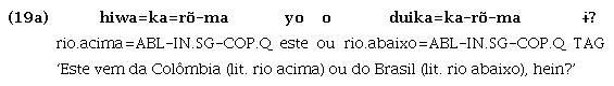 Com relação ao morfema =rɨ̃ ‘interrogativo 2a pessoa’18, é importante notar que a estratégia principal para se fazer perguntas em Kubeo é o uso de um padrão entoacional. O verbo da oração aparece em uma forma não finita e, fora =rɨ̃ (e palavras interrogativas), não há outro marcador morfossintático de perguntas na língua. Isso nos sugere que se trata de uma partícula enclítica do sintagma usada como um elemento adicional para reforçar um ato ilocucionário que demanda mais enfaticamente uma resposta do ouvinte.