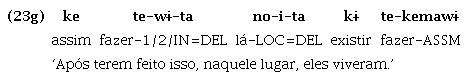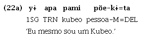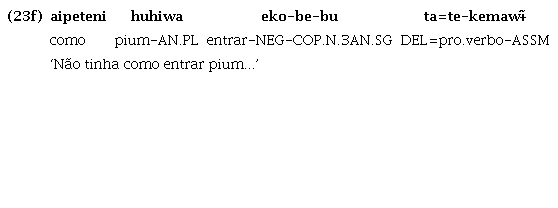 Por último, o Kubeo possui um conjunto de morfemas que, de diferentes maneiras, enfatizam certos constituintes ou aspectos semânticos de uma oração. Os exemplos em (23) são do morfema =ta= ‘delimitador’, que pode ser enclítico ou proclítico a depender de questões prosódicas, cuja função é decorrente da semântica da oração, da estrutura informacional do discurso e do jogo pragmático estabelecido entre falantes e ouvintes. Em (23a) a (23c), mostramos sua função como intensificador ou marcador de ênfase de modificadores verbais e nominais. Com verbos no aspecto progressivo, ele determina o início aspectual da ação – a exemplo de (23d). Com argumentos, ele implica foco contrastivo – a exemplo de (23e). Precedendo a um pro-verbo, ele ocorre na função de enfatizar o conteúdo de um predicado anterior a que o pro-verbo retoma – a exemplo de (23f). Com conjunções, ele reforça relações de casualidade entre diferentes sentenças – a exemplo de (23g).