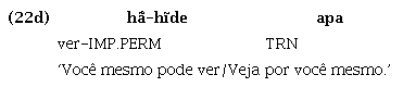 Um outro marcador pragmático apa ‘turno’ realça um constituinte ou outro elemento da sentença e demanda uma posição do ouvinte com relação a este elemento focado. Em (22a), vemos que o falante foca em si mesmo em uma frase retirada de uma canção de namoro, onde apa é bastante recorrente quando o enamorado fala de si. Em (22b), o foco muda do ouvinte para o locutor. Em (22c), o foco está em uma nova situação na qual o falante se baseia. Em (22d), apa muda o foco para o ouvinte junto ao verbo no modo imperativo permissivo20.