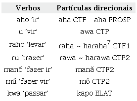 A origem das partículas dêiticas direcionais, segundo Magalhães (2007), são os verbos -aho ‘ir’ e -u ‘vir’, que ocorrem de forma independente na língua. As formas comitativas -raho ‘levar’ e -ru ‘trazer’ e causativas simples -monõ ‘fazer ir’ e -mũ ‘fazer vir’, já lexicalizadas, também ocorrem independentemente na língua, são sincronicamente inanalisáveis8 e geraram as partículas raha, rawa, manã e mõ, respectivamente.