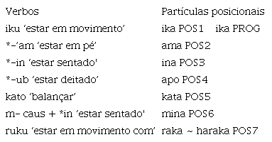 As partículas posicionais são provenientes dos verbos -iku ‘estar em movimento’, *-’am ‘estar em pé’, *-ub ‘estar deitado’ e *-in ‘estar sentado’10 , respectivamente. A partícula kata ‘em movimento pendular’ possivelmente tem sua origem no verbo kato ‘balançar’, a partícula mina ‘fazendo sentar’ corresponde à versão causativa da partícula ina e a partícula raka11 é a versão comitativa da partícula ika.
