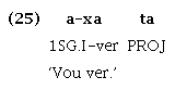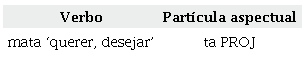 Já no caso da gramaticalização do verbo *mata ‘querer/desejar’, que sofreu erosão fonética (o verbo dissilábico tornou-se uma partícula monossilábica) e enfraquecimento semântico, resultando na partícula de aspecto projetivo ta, é possível atestar que a origem dessa partícula provém da possibilidade estrutural que a língua apresenta de permitir que determinadas raízes verbais ocorram como segundo verbo de uma sequência verbal, sem marca morfológica de pessoa ou qualquer marca de subordinação, como ilustrado a seguir15 :