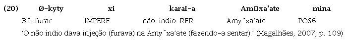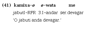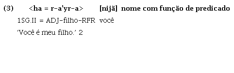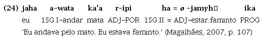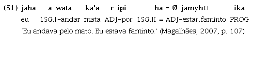 Em Guajá, conforme explicam Magalhães e Mattos (2014), verifica-se o mesmo fenômeno gramatical: verbos, nomes e também advérbios (ou expressões adverbiais) podem exercer a função sintática de predicado, ou seja, têm função predicativa primária sem precisar de cópula ou qualquer outro recurso morfossintático, não se podendo associar apenas ao verbo uma vocação predicativa, conforme atestam os exemplos abaixo1 :