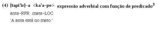 É possível observar, assim, o mesmo comportamento morfossintático entre verbos eventivos (1), verbos estativos (2), nomes (3) e expressões adverbiais (4), ou seja, todos eles podem exercer primariamente a função de predicado sem o acréscimo de qualquer morfologia derivacional ou cópula, apesar de nomes serem mais usados como argumentos, verbos como predicados e expressões adverbiais como adjuntos.