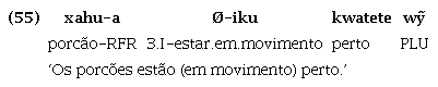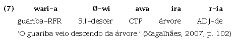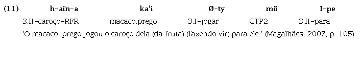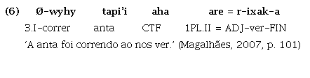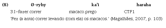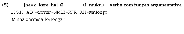 Assim, o Guajá ilustraria uma fase intermediária no processo diacrônico de degradação de um hipotético estado Proto-Tupí omnipredicativo, o que pode ser evidenciado, entre outras características que serão aqui apresentadas, pelo fato de já não permitir que verbos funcionem como argumento sem que sejam antes nominalizados6. Isto é, no Guajá, apesar de ambas as classes, verbos e nomes funcionarem primariamente como predicado, como ilustrado nos exemplos (1) a (3), para que a função argumental seja exercida, os verbos devem receber morfologia derivacional nominalizadora, como em (5):