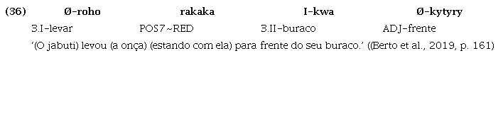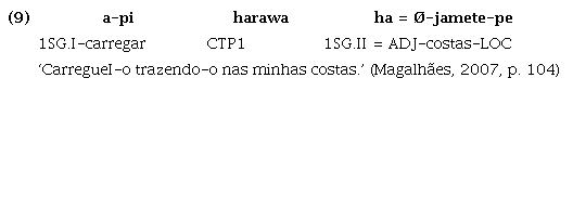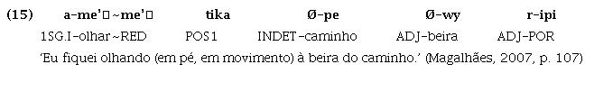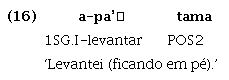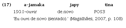 d) as partículas posicionais conservam um antigo prefixo t- que indica a correferência para a primeira pessoa. Essa marca gramatical de correferência não é encontrada em verbos plenos da língua, mas pode ser encontrada, plenamente ativa, por exemplo, em verbos posicionais na língua Tembé, como exemplificado na nota de rodapé 9. A gramaticalização das partículas posicionais com o referido prefixo de correferencialidade evidencia que esse processo ocorreu em um período em que o prefixo ainda era ativo em verbos plenos da língua.