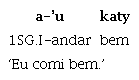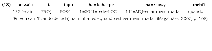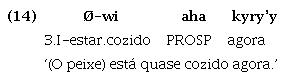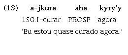 Com relação especificamente à partícula aha, que expressa direção centrífuga e tem origem no verbo ‘ir’, podemos afirmar que seu uso direcional se estendeu também para expressar aspecto prospectivo, isto é, uma confluência entre tempo e aspecto que tem a função de indicar, no caso do Guajá, a antecipação de um estado futuro iminente. Seu uso como partícula de aspecto prospectivo pode ser atestado pelos exemplos (13) e (14), quando ocorre associada a verbos que exprimem estado, e não a verbos que exprimem deslocamento: