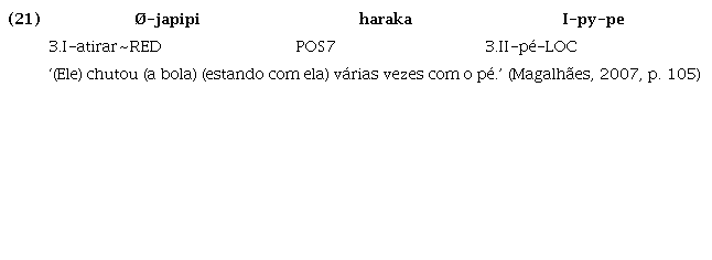 São sete as partículas posicionais do Guajá, conforme ilustram os exemplos (15) a (21), a seguir: