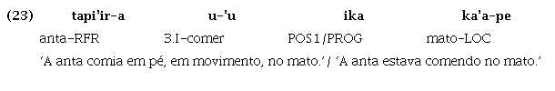 No que se refere especificamente à partícula ika, que tem origem no verbo posicional iku e expressa posição em pé e em movimento (isto é, o participante da ação/evento deve estar simultaneamente em pé e em movimento), podemos afirmar que seu uso posicional se estendeu e tem se especializado em expressar aspecto progressivo. O verbo posicional iku ‘estar em pé e em movimento’, que existe plenamente como verbo lexical – ver o exemplo (22) –, gramaticalizou-se, em processo paralelo, em partícula e o resultado semântico da combinação da partícula com os verbos vai depender do tipo de verbo com o qual ela é associada. Com verbos eventivos, pode denotar tanto posição quanto aspecto progressivo, como ilustrado em (23). Associada a verbos estativos, indica um estado em progressão, como pode ser atestado pelo exemplo (24).