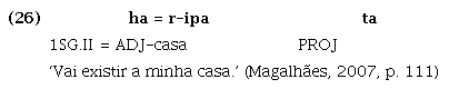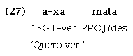 A partícula ta(r) expressa aspecto projetivo por indicar a projeção de um evento ou estado a ser realizado ou a existência de uma entidade a ser concretizada (Magalhães, 2007, p. 111)13. Ocorre associada a predicados verbais, como em (25), e predicados nominais, como em (26), e tem sua origem, conforme apresentado no Quadro 3, no verbo *mata(r) ‘querer/desejar’, para o qual se encontram cognatos em outras línguas da família, mas que deixou de existir como verbo lexical pleno no Guajá, isto é, não ocorre mais associado a morfemas pessoais, apesar de, a depender do contexto, ainda ocorrer em construções verbais mantendo sua forma mais estendida e semântica desiderativa, como em (27):