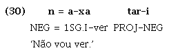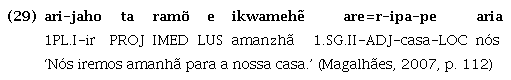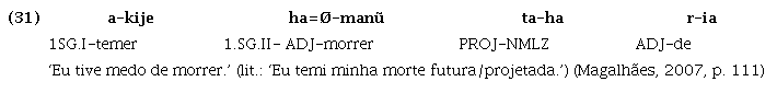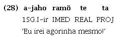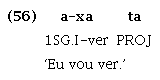 A partícula que exprime aspecto projetivo ocorre em posição intrapredicado, conforme descrito em Magalhães (2007). As partículas intrapredicado, apesar de assemelharem-se aos sufixos por serem afetadas por processos morfofonológicos similares aos que ocorrem nos limites de morfemas dentro da palavra, são palavras independentes, pois têm acento próprio e o núcleo do predicado em que ocorrem mantém seu acento original. Além disso, podem ocorrer em sequência e permutar-se entre si, como pode ser observado comparando-se (28) com (29), em que naquele a partícula intrapredicado projetiva ta ocorre após a partícula intrapredicado imediativa ramõ, enquanto neste ela precede a mesma partícula. Tais especificidades impedem a caracterização das partículas intrapredicado como sufixos. Estas partículas, como ta, diferenciam-se também dos advérbios, por ter posição fixa obrigatória pós-núcleo do predicado, além de formar com ele um predicado único, monooracional, o que fica evidente por meio dos marcadores de negação descontínua (n= ... -i), que têm escopo sobre todo o predicado, como ilustrado em (30), e por meio da nominalização do predicado verbal, cujo sufixo ocorre após a sequência verbo + ta, como ilustrado em (31).
