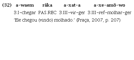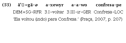 Na língua Tapirapé, por exemplo, conforme explicado por Praça (2007, p. 207), os verbos de movimento yj ‘correr’, xar ‘vir’, a ‘ir’, xewyr ‘voltar’, quando ocorrem após um verbo da oração principal, na posição de verbo subordinado no referido ‘modo gerúndio’, expressam a direcionalidade da ação evidenciada pelo verbo principal, como nos exemplos (32) e (33):