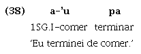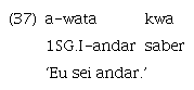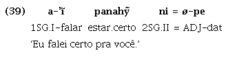 Os exemplos (37) e (38) mostram os verbos kwa ‘saber’ e pa ‘terminar’, que também ocorrem como verbos lexicais associados a marcas de pessoas (a-kwa ‘eu sei’; Ø-pa ‘(isto) acabou’), ocorrendo como segundo verbo de uma construção específica que envolve sequências verbais (verbo 1 + verbo 2) em que o primeiro verbo leva a marca de pessoa e é seguido por outro sem índice pessoal ou qualquer marca de subordinação ou coordenação. Os exemplos (39), (40) e (41) mostram os verbos estativos parahỹ ‘estar certo/bonito/bom’, manahỹ ‘estar errado/feio/ruim’ e me ‘estar devagar’, que, da mesma forma que os dois anteriores, ocorrem como verbos lexicais plenos associados a marcas de pessoas (ha=Ø-parahỹ ‘eu sou bonito’; ha=Ø-manahỹ ‘eu sou feio’; Ø-me ‘ele é devagar’), mas figuram também como segundo verbo, em uma sequência verbal (verbo 1 + verbo 2). Os dois verbos da sequência verbal compartilham os mesmos argumentos e formam uma oração cujas propriedades entonacionais são idênticas às de uma oração com apenas um verbo. Até o momento, são esses cinco verbos ora citados os únicos identificados que podem ocorrer nesta posição, sincronicamente. No entanto, essas sequências verbais têm todas as características listadas por Aikhenvald e Dixon (2006, p. 4, tradução nossa) para definir as construções de verbos seriais (SVC):