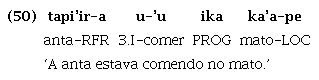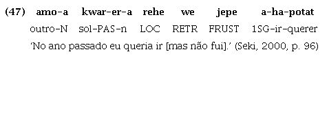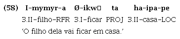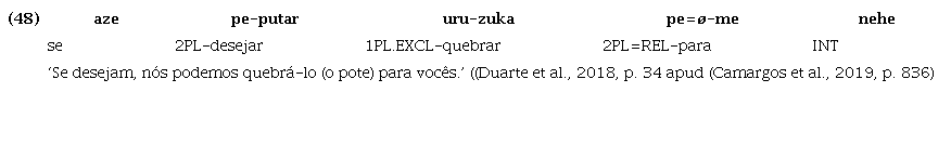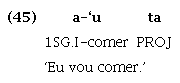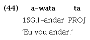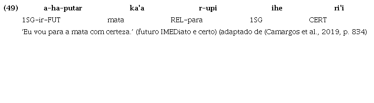Da mesma maneira, em Tenetehara, a raiz cognata putar ‘querer/desejar’ ainda é utilizada como verbo lexical, sendo associada às marcas de pessoa, como em (48), mas, paralelamente, também ocorre associada ao verbo lexical, sem marca de pessoa, expressando, segundo a interpretação de (Duarte et al. (2018), tempo futuro, como em (49):