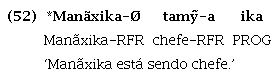 Em uma língua plenamente ominipredicativa, é de se esperar que as partículas que expressam noções gramaticais associadas ao predicado sejam usadas com todos os itens lexicais predicáveis. A partícula ika, descrita na subseção “Partículas posicionais”, que expressa posição em pé e em movimento, estendeu seu uso posicional, conforme explicado anteriormente, e tem se especializado em expressar aspecto progressivo. No entanto, o uso desta partícula foi apenas registrado em orações que têm verbos como núcleo do predicado, como mostram os exemplos (22) e (24), repetidos aqui como (50) e (51), mas nunca com nomes ou expressões adverbiais em função de predicado. As tentativas de construção de sentenças com núcleos de predicado nominais e adverbiais associados a essa partícula, conforme os exemplos (52) e (53), foram consideradas agramaticais pelos falantes:
