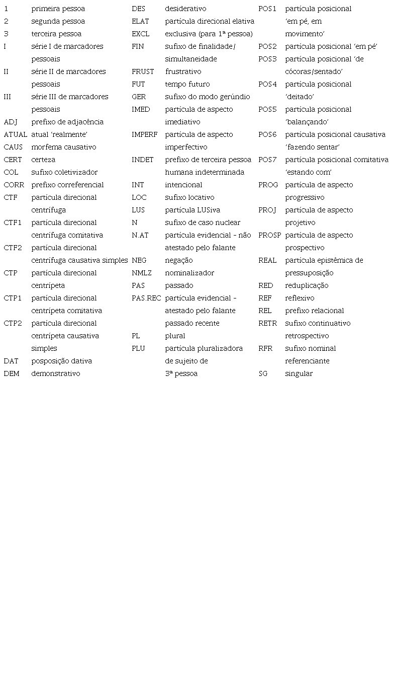 O propósito deste artigo foi mostrar que, apesar de a classe das partículas ser apresentada, de maneira geral nas línguas documentadas, como uma classe inconsistente em termos formais e heterogênea em termos funcionais, é possível, no caso do Guajá, delimitar de maneira consistente a existência dessa classe e explicitar a origem verbal de algumas delas. Assim, enfocamos a análise das partículas direcionais, posicionais e da partícula de aspecto projetivo da língua Guajá, atribuindo sua origem a diferentes processos de gramaticalização a partir de verbos plenos, a saber: i) a gramaticalização de verbos de movimento e posição em partículas direcionais e posicionais a partir de estruturas subordinadas, marcadas com sufixo de finalidade/simultaneidade; e ii) a gramaticalização do verbo ‘querer/desejar’ em partícula de aspecto projetivo a partir de uma construção serial verbal.