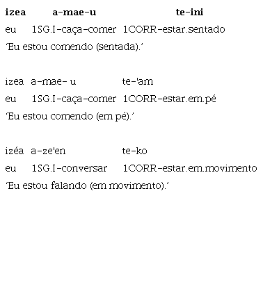 c) partículas posicionais como ama ~ tama ‘em pé’, apo ~ tapo ‘deitado’ e ina ~ tina ‘de cócoras/sentado’, provêm do gerúndio dos verbos *-’am ‘estar em pé’, *-ub ‘estar deitado’ e *-in ‘estar sentado’, que não existem mais como verbos plenos na língua, mas são atestados em línguas aparentadas mais antigas, por meio de dados registrados há vários séculos, como os da língua Tupinambá;