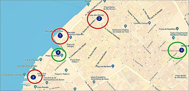Os espaços verdes na Figura 1 representam os lugares menos frequentados, mas há registros da presença da APF na região da praça Siqueira Campos, conhecida como Praça do Relógio (área 4 na Figura 1), próximo ao porto de ancoragem dos barcos pesqueiros e ao porto do Açaí, onde havia o antigo necrotério de Belém. Bruno e Dalcídio, passantes, frequentadores ou contempladores do local, recriam aquele espaço em cenas de suas obras literárias.