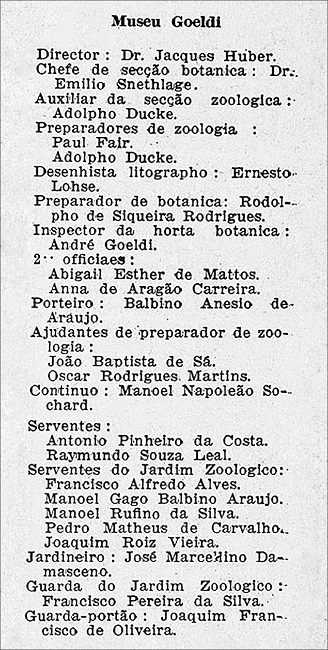 Da época áurea de Emílio Goeldi só restara no Museu, em 1919, Emília Snethlage como cientista e mais alguns antigos preparadores, em especial o Sr. Rodolfo Siqueira Rodrigues, e auxiliares. Adolfo Ducke, no início de sua carreira entomólogo e depois botânico, desde fins de 1918 transferiu-se para o Jardim Botânico do Rio de Janeiro.