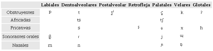La realización de los segmentos /p m t ɾ n tʃ ɕ j k ɰ ŋ/ es invariable y corresponde a sus valores en el Alfabeto Fonético Internacional (AFI) 8. Obsérvese que en esta propuesta ciertas alternancias entre consonantes (como aquellas que involucran la palatalización) se atribuyen a procesos que operan en el nivel morfofonológico, como se mostrará en las secciones subsiguientes. Por ello, no se considera, por ejemplo, que el fonema /t/ posee un alófono [ tʲ̠], sino que se propone postular una alternancia morfofonológica entre los fonemas /t/ y / tʲ/ (y otros pares similares).
