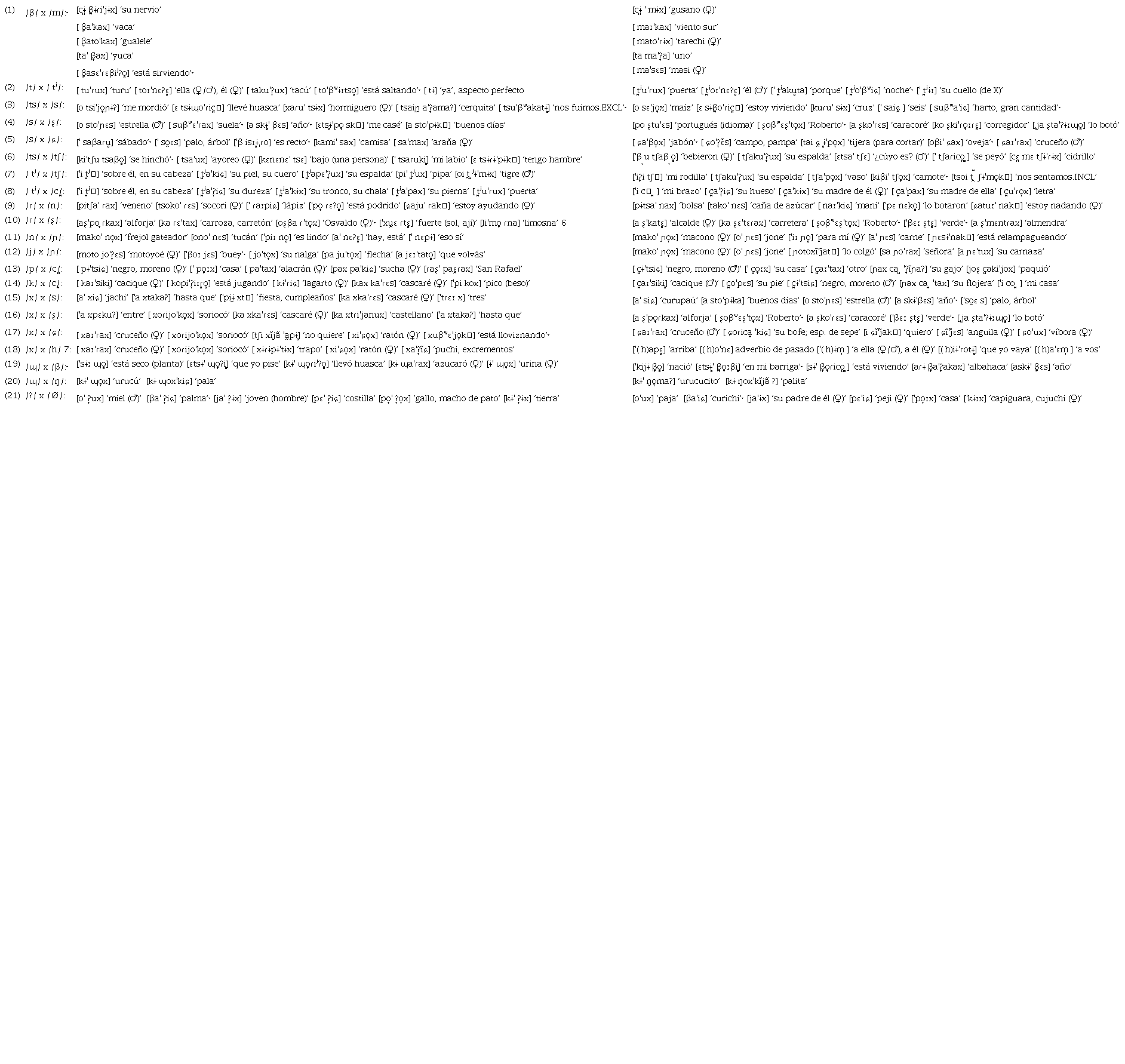 En ( 1–21), se demuestran algunos contrastes fonológicos con pares mínimos o análogos. Por razones de espacio, se dará preferencia a los pares de segmentos para los que se haya reportado ausencia de contraste en otras variedades del chiquitano 5.