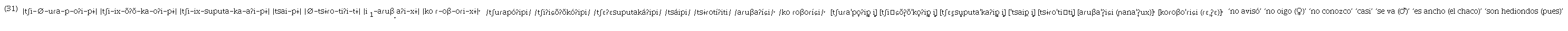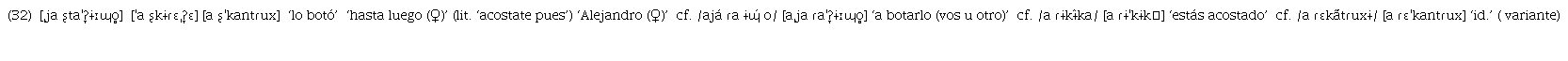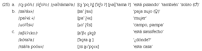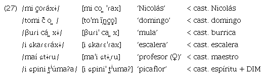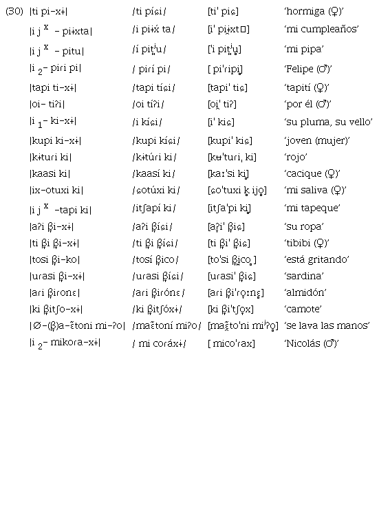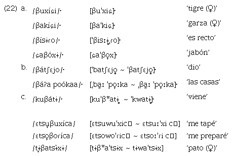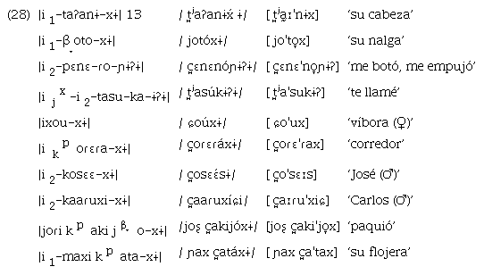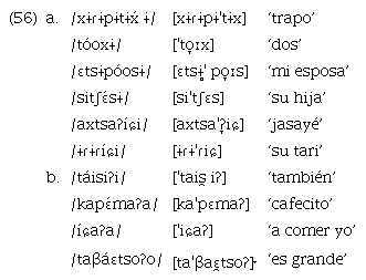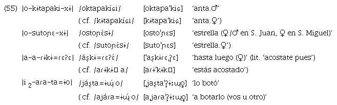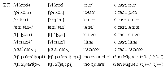 Hay dos dificultades posibles para el análisis propuesto aquí. La primera consiste en la existencia de palabras en las que la palatalización no ocurre a pesar de que haya condiciones para ello. Se trata de algunos préstamos del castellano y, en el subdialecto de San Juan, de las formas que contienen el prefijo negativo/condicional /tʃi-/ (en San Miguel y en otras comunidades este mismo prefijo tiene la forma /tʃɨ-/), como se muestra en ( 26).
