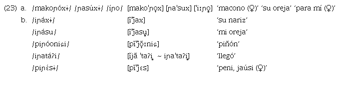 El segmento /ɲ/ suele realizarse como una oclusiva nasal palatal sonora [ɲ] ( 23a), pero tras la vocal anterior alta /ɲ/ puede perder la oclusión y se realiza como una aproximante nasalizada, nasalizando también la vocal precedente ( 23b).