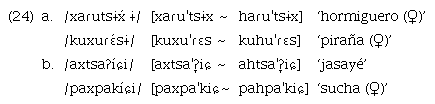 A continuación, se ilustra la aplicación regular del proceso de palatalización progresiva desencadenado por los segmentos finales de los prefijos |i 1-| 3SG ( 29a), |i 2-| HT ( 29b), |i 2-| M.♂ ( 29c), |ix-/ij-| 1SG.♀/♂ ( 29d), |tsoij-| 1EXCL ( 29e), así como por la vocal final de las raíces ( 29f), afectando los segmentos iniciales de los sufijos |-xɨ| X, |-kaa| PL, |-maʔa| DIM, |-ka| F.SAP, |-ko| F.3, |-ka| F.CLIM, |-ta| 3SG.OBJ, |-taiki| PL.KIN, |-po| NMLZ.INSTR, |-β̞o| TRANSL.