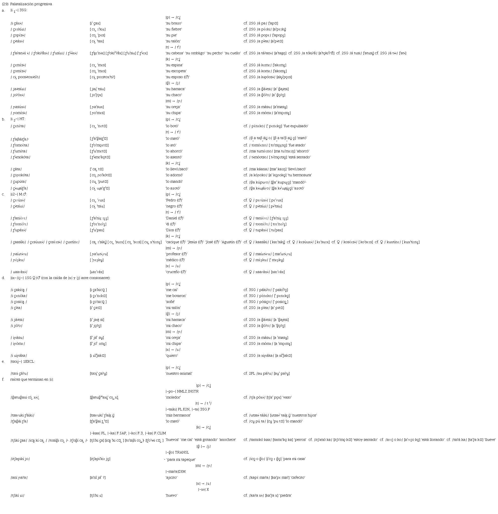 La palatalización progresiva es un proceso omnipresente en el chiquitano migueleño; consiste en que las consonantes |p β̞ m t k x| subyacentes son sustituidas por / c j ɲ t ʲ c ɕ/ , respectivamente, en determinados ambientes 11. En términos de los rasgos distintivos, se podría proponer la siguiente generalización: las consonantes [+labiales] y [+velares] se palatalizan a [+palatales] manteniendo el modo de articulación, mientras que la consonante [+dentoalveolar] |t| se palataliza a su contraparte [+postalveolar] / tʲ/ (las demás consonantes [+dentoalveolares] —esto es, |ts s ɾ n|— no se palatalizan, ya que el inventario del chiquitano migueleño no tiene africadas, fricativas o sonorantes [+postalveolares]). Para las consonantes |p β̞ m t k|, el ambiente condicionante es la posición entre una vocal |i| o |ĩ| subyacente y cualquier vocal que no sea |i ĩ|12. Esta última condición no se aplica a la |x|, que se palataliza tras |i ĩ| sin importar la vocal que le sigue. Las evidencias que muestran que la palatalización es un proceso activo incluyen los siguientes hechos: