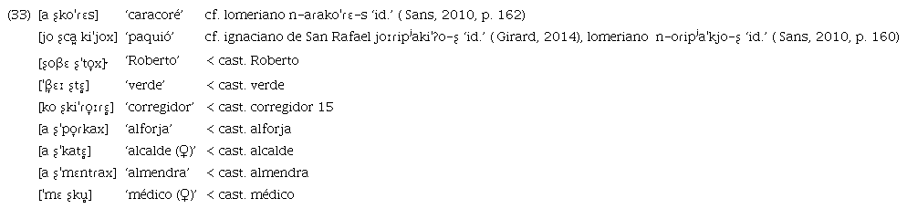 Otros ítems no presentan alternancias sincrónicas (o por lo menos no se han atestiguado las respectivas alternantes con /ɾ/), pero en sus cognados en otras variedades del chiquitano —o en sus étimos en el caso de los préstamos— a la /ʂ/ en coda del chiquitano migueleño le corresponde /ɾ/ (y en el caso del castellano, cualquier consonante líquida o el alófono [ð̞] del fonema /d/), como se muestra en ( 33).