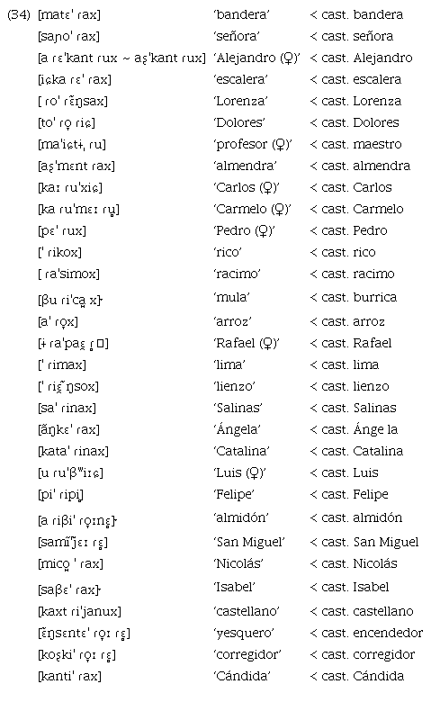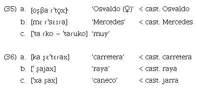 Obsérvese que los mismos fonemas líquidos del castellano (/ɾ/, /r/̄ , /l/, /ʎ/ 16, bien como el alófono [ð̞] del fonema /d/ o cualquier secuencia de éstos) se sustituyen por /ɾ/ en la posición de ataque en los préstamos (el alófono [d] del fonema /d/ del castellano se adapta consistentemente como /t/), como se muestra en ( 34) a continuación.