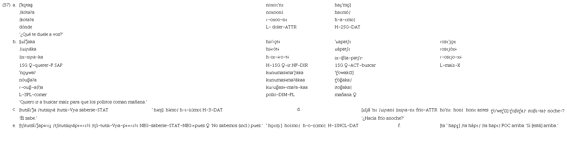 Una posibilidad que merece ser investigada en el futuro es que la consonante [h] emerge en la superficie a través de un proceso de sandhi, cuando un morfema que termina en una |h| subyacente (por ejemplo, |-nɛh| ATTR, |-Vɲah| STAT, |tah| FOC/COP/SUB) es seguido por un morfema que empieza con una |h| subyacente (por ejemplo, |hapɛ| ‘arriba’). Sin embargo, la ocurrencia de [h] en ejemplos como ( 37b, e) permanecería sin explicación: son los únicos ejemplos en mi corpus en que [h] ocurre tras /-ka/ F.SAP y /=ɾɛʔɛ/ ‘pues.♀’, respectivamente. Por ende, no se propondrá una explicación universal para todas las instancias de /h/ hasta que un corpus más extenso sea analizado.
