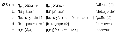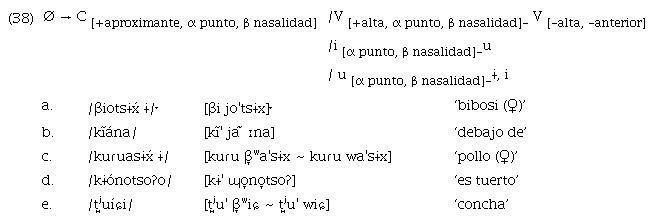 Una inspección del léxico registrado muestra que el chiquitano migueleño no presenta secuencias del tipo V [+alta]V [-anterior] (ni tampoco las secuencias *iu, *uɨ, *ui) en la superficie en el interior de palabras. Por el otro lado, se destaca la alta frecuencia de las secuencias del tipo [ijV], [ĩjṼ ], [uβʷV], [ɨɰV]. Además, es importante notar que la consonante [ɰ] ocurre exclusivamente en el ambiente ɨ_V. Ello podría sugerir que las instancias de [j], [j]̃ , [βʷ] y [ɰ] en dichos contextos deban analizarse como automáticas, es decir, que una regla fonológica de epéntesis inserte una aproximante tras vocales altas seguidas de otra vocal que no sea alta ni anterior, así como en los ambientes i_u, u_ɨ/i ( 38). Obsérvese que ello permitiría reducir el inventario de segmentos consonánticos a través de la eliminación de /ɰ/: todas las ocurrencias de ese segmento podrían atribuirse a la regla de epéntesis (por ejemplo, /ɨóxɨ/ [ɨˈɰo̞x] ‘urina.♀’).