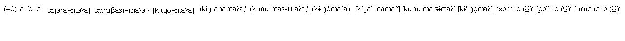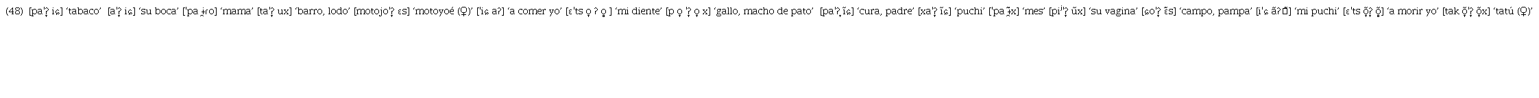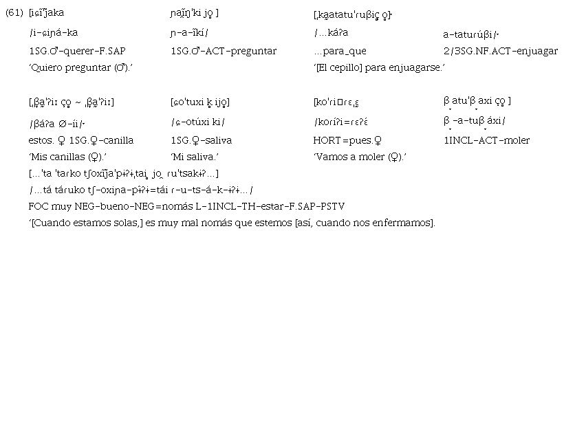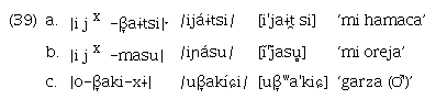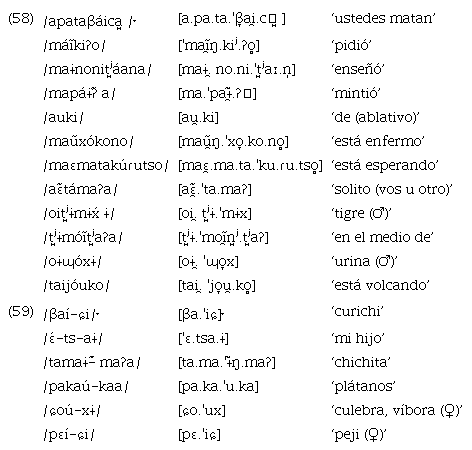 El primer argumento consiste en el hecho de que las secuencias [ijV], [ĩjṼ ] y [uβʷV] ocurren también en palabras morfológicamente complejas en que se puede demostrar que las aproximantes son realizaciones de fonemas consonánticos ( 39). Lo contrario no ocurre: no se sabe de ninguna palabra cuya composición morfológica nos obligue a analizar como epentéticas las aproximantes que son parte de secuencias de ese tipo.