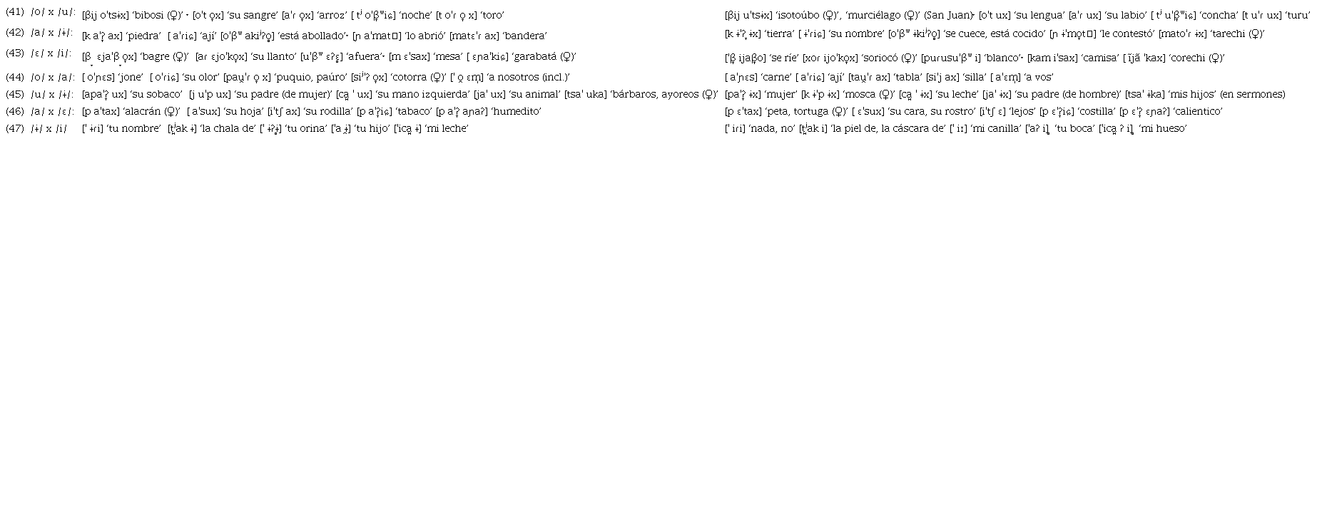 En ( 41–47), se muestran algunos contrastes fonológicos con pares mínimos o análogos entre las vocales orales.