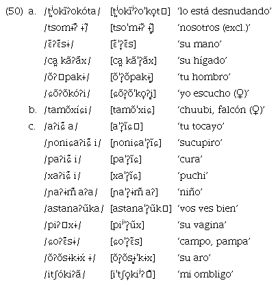 Un fenómeno de elisión que sí se atribuye al nivel posléxico afecta las secuencias finales átonas de dos tipos: /-xɨ, -sɨ, -ɕi/ ( 56a) y /-VʔV/ ( 56b). Las secuencias del primer tipo ocurren como alomorfos del sufijo |-xɨ| X (sustantivo singular, no diminutivo, sin un poseedor referencial) o como partes no segmentables de raíces (como en |-kɨpoosɨ| ‘esposa’). Las secuencias afectadas del segundo tipo involucran vocales átonas idénticas separadas por una oclusiva glotal; en este caso la vocal final se suele elidir completamente. Si las vocales no son idénticas o si el acento recae en una de ellas, la elisión no ocurre: /ɨṕ oʔi/ [ˈɨpoʔi]̥ ‘adentro’, /áuki náʔa/ [ˌau̯kiˈnaʔḁ] ‘de aquí’.