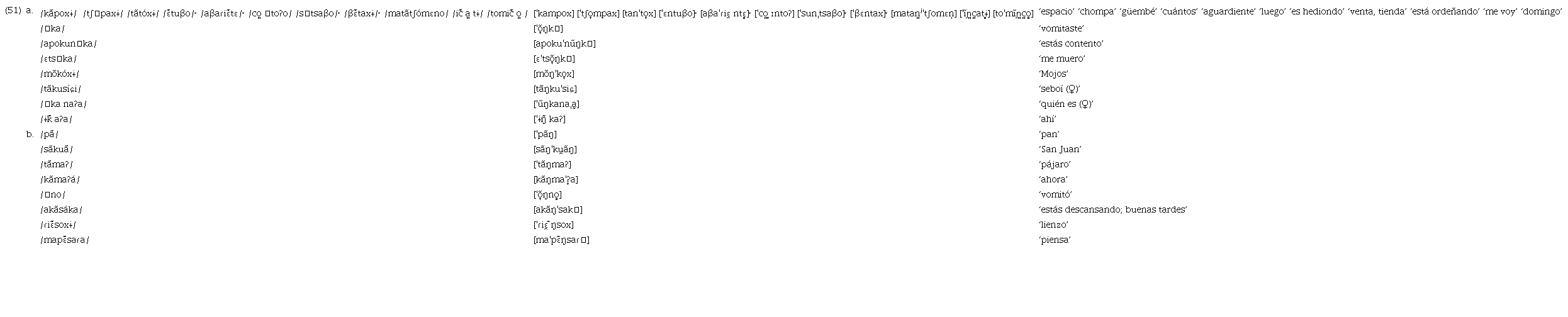 El ítem [aɨˈ̯ ɰo̞xɨ] ‘recién, ahorita’ se realiza siempre con una vocal final, sin la esperada elisión (compárese /tamokóxɨ/ [tamoˈko̞x] ‘perro’), lo que se captura representando este ítem como /aɨɰóxɨɨ/.