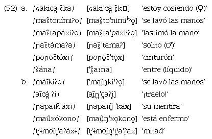 En cuanto a las secuencias vocálicas tautosilábicas (ver ‘Silabificación’) cuyo último elemento es una vocal nasal, llama la atención el hecho de que las secuencias /aɛ̃, oɛ̃, ɛ̃a/ jamás adquieren una constricción bucal final, realizándose simplemente como [aɛ̯̃, o̯ɛ̃, ɛ̯̃a] delante de cualquier consonante ( 52a). En cambio, las secuencias tautosilábicas cuyo segundo elemento es una vocal nasal alta (/aĩ aɨ̃ aũ oĩ/) adquieren una constricción bucal final delante de las consonantes (incluyendo /x/ pero excepto /ʔ/, 52b).