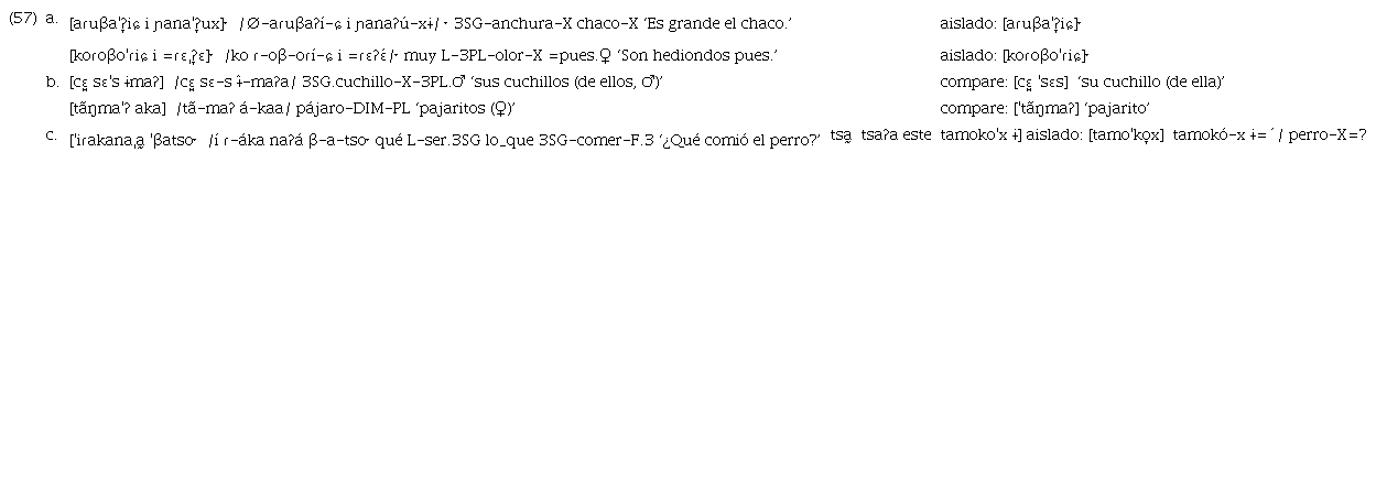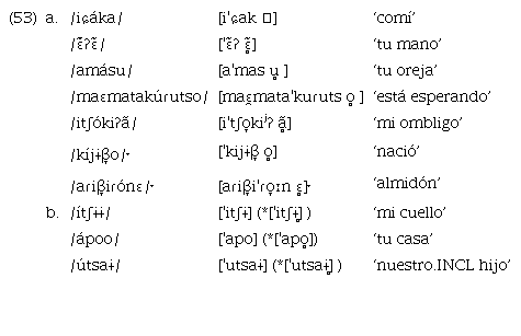 El hecho de que las palabras como aquellas en ( 56) contienen una vocal final subyacente se hace evidente en el habla fluida ( 57a), cuando hay sufijación ( 57b) y en las preguntas de contenido, que presentan un fenómeno de desplazamiento acentual hacia la derecha ( 57c).