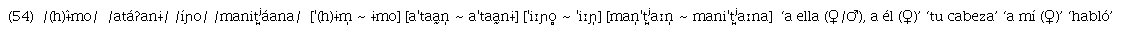 La /h/ móvil ocurre al inicio de algunas formas flexionadas de la adposición dativa ( 37a, c, e) y en las formas no finitas de los verbos ( 37b), siempre que éstos tienen por su segmento inicial una vocal. Además, es parte de algunos adverbios, como /(h)apɛ/ ‘arriba’ y /(h)onɛ/ ‘en el pasado’ ( 37d, f) 18. En esta etapa de la investigación no se puede proponer una generalización descriptiva que explique todas las (no) ocurrencias del supuesto fonema /h/ en el habla fluida. Su ocurrencia o no ocurrencia parece estar condicionada por el contexto izquierdo: /h/ suele ocurrir con bastante frecuencia tras los predicados atributivos en /-nɛ/ ( 37a, d), estativos en /-Vɲa/ ( 37c) y la partícula multifuncional /ta/ FOC/COP/SUB ( 37f), pero también en otros contextos ( 37b, e).